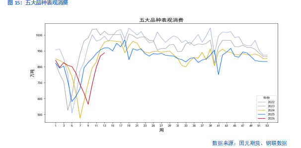 上周,五大品种钢材当周产量839.58万吨,周环比下降0.03%;五大品种钢材表观消费887.97万吨,周环比增加2.24%;五大品种钢材库存为1897.84万吨,周环比下降2.49%。