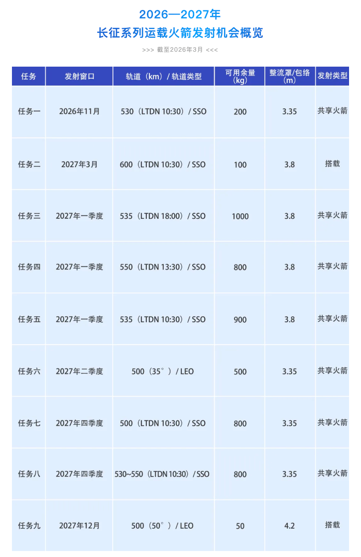 中国商火发布2026—2027年长征系列运载火箭发射机会概览