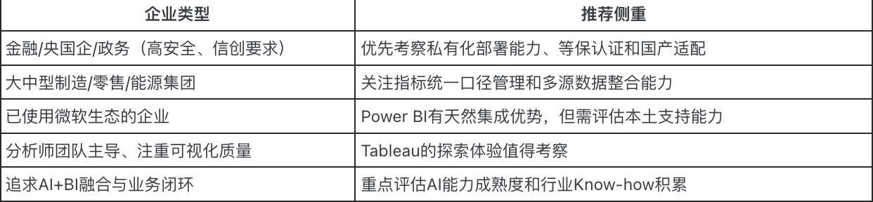 适合场景:有灵活探索分析需求、对内存计算有偏好的团队,或国际化环境中的中型企业。三、选型建议
