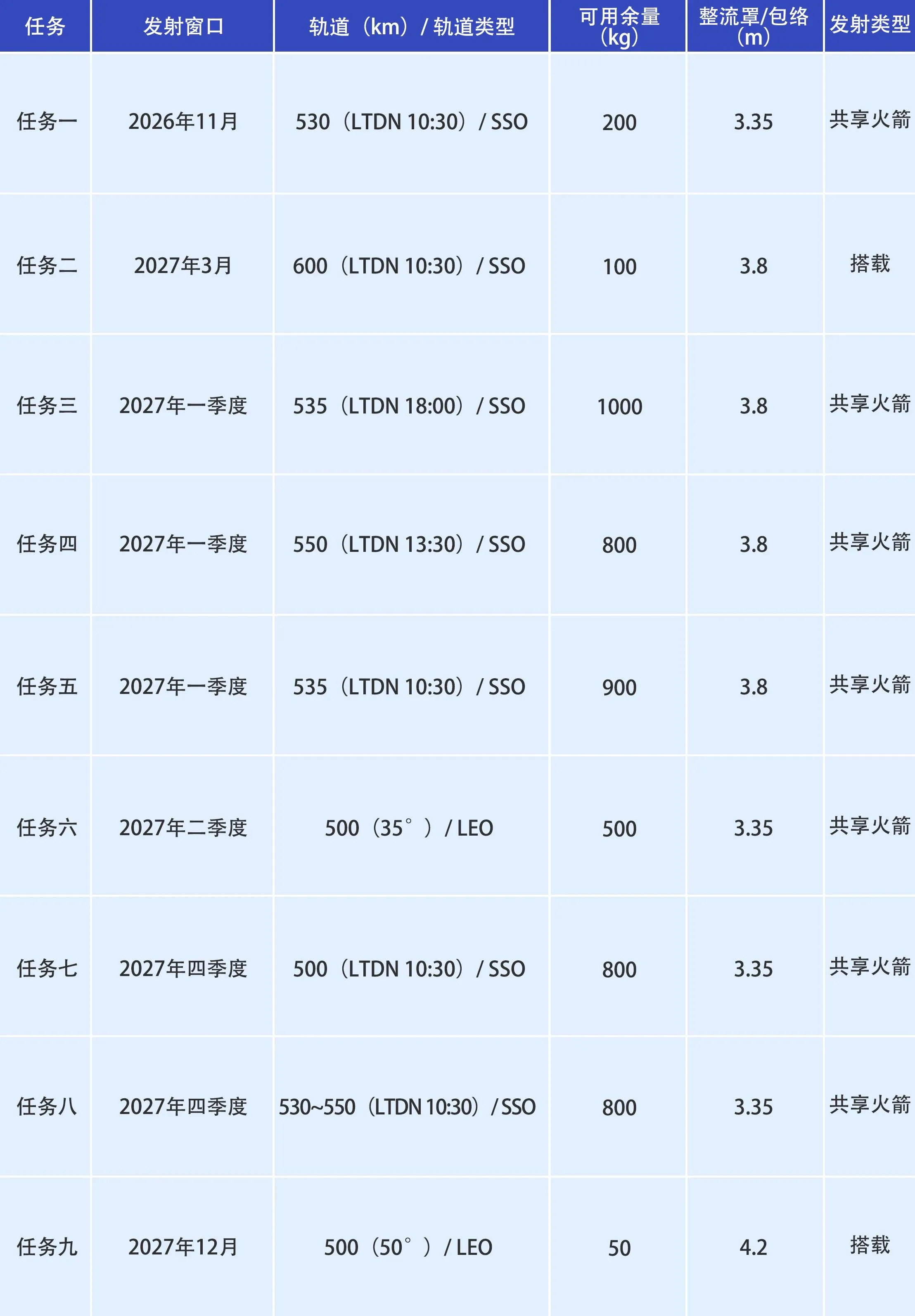 2027年第四季度有2次共享火箭任务,轨道均为高度530至550公里太阳同步轨道,整流罩直径3.35米,可用余量均为800公斤;