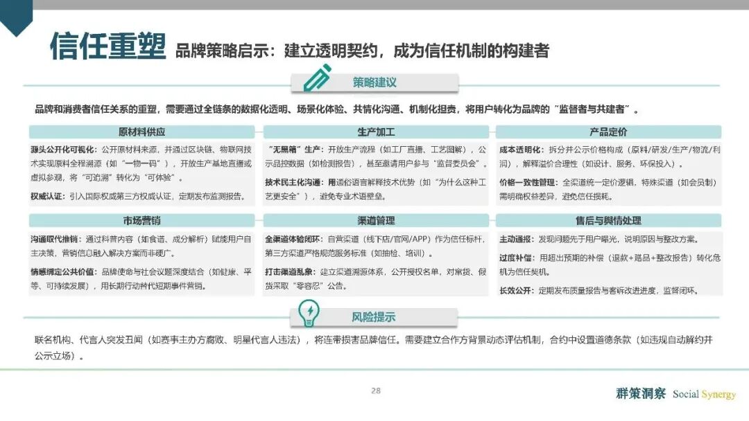 信任重塑:透明为底线,重建商业信任契约。《报告》强调,“全人消费”时代,品牌与消费者的关系已从“单向输出-被动接受”转变为“双向共建-相互监督”,透明不再是品牌的加分项,而是进入消费市场的基本门槛。品牌必须通过全链条的数据化透明、场景化体验、共情化沟通、机制化担责,构建全新的信任契约。