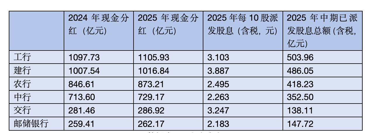 从分红节奏来看,六家国有大行均为“中期+末期”分红机制,其中2025年六大行中期分红合计超2000亿元;分红比例均在30%左右,且每家银行分红总额均实现同比增长。