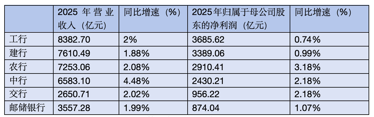 从归母净利润上看,2025年,工行、建行均超3000亿元,农行、中行、交行同比增速超2%,邮储银行同比增长1.07%。