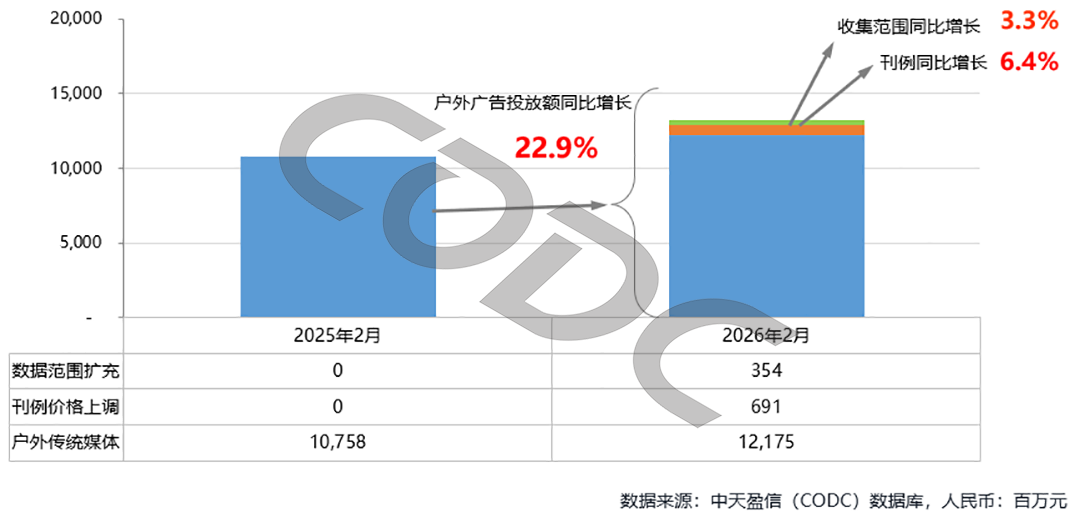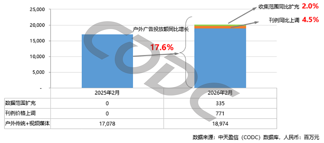 2026年2月,国内经济开局向好,户外广告市场同步迎来强劲复苏,展现出高增长韧性。据CODC户外研究发布的《2026年2月国内户外广告消费动态》显示,当月户外广告投放总额达200.80亿元,同比增长17.6%,虽受季节性因素影响环比减少10.7%,但排除范围扩大与刊例价格增长的干扰后,广告净值同比仍实现11.1%的正向增长,彰显出市场核心增长动力的稳固。