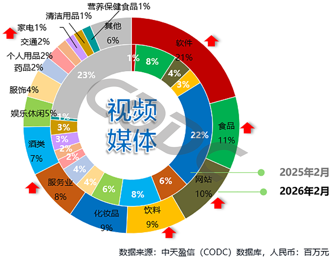2026年2月,户外视频媒体的行业投放呈现“头部集中、结构优化”特征,广告主投放方向与民生消费、科技发展等领域深度绑定,行业分布更趋合理。
