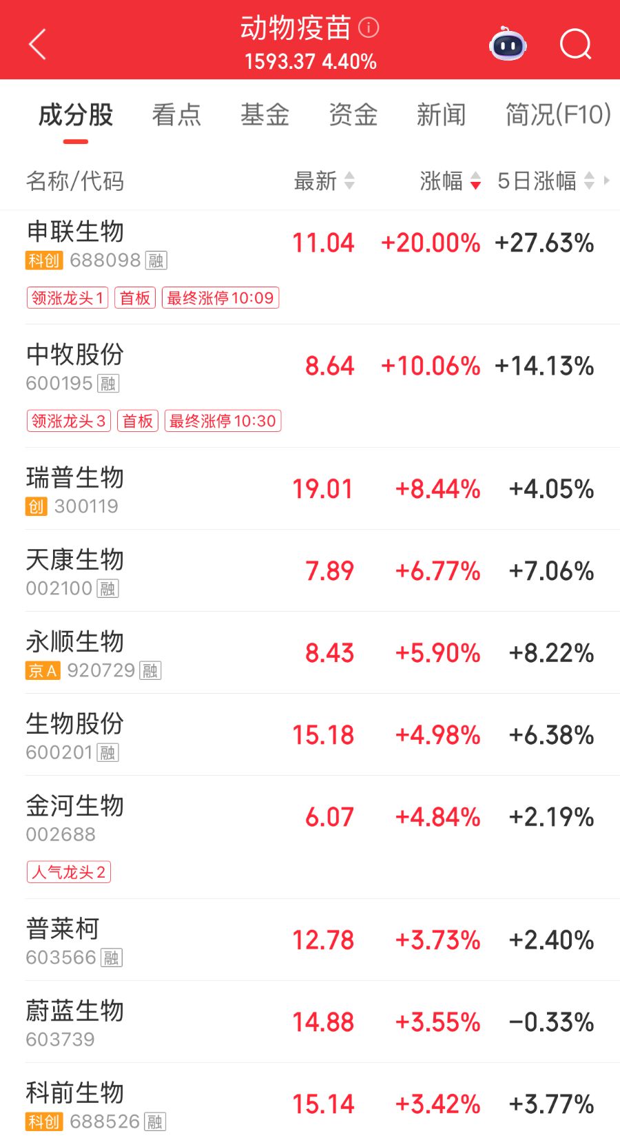 4月7日,动物疫苗概念大幅走强。截至午间收盘,申联生物20cm涨停,中牧股份(600195)10cm涨停,瑞普生物(300119)、天康生物(002100)、永顺生物等多只概念股跟涨。