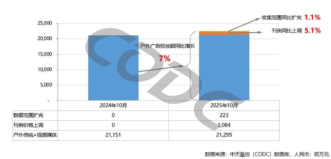 中天盈信(COCD)发布户外广告消费动态,为行业发展提供了关键参考。报告显示,2025年10月,户外广告投放总额226.07亿元,同比增长7%,环比下降13%,排除范围和刊例增长外,净值同比增加0.7%。