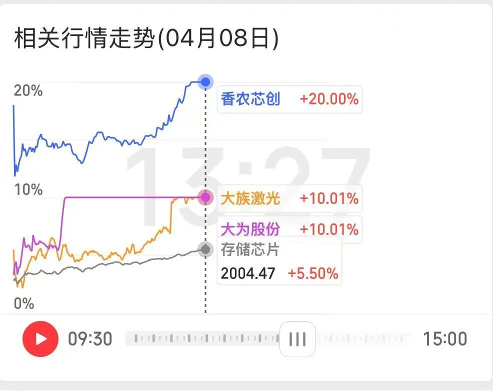 4月8日午后,存储芯片板块持续上涨,香农芯创(300475)(+20.00%),大族激光(002008)(+10.01%),大为股份(002213)(+10.01%)纷纷涨停。