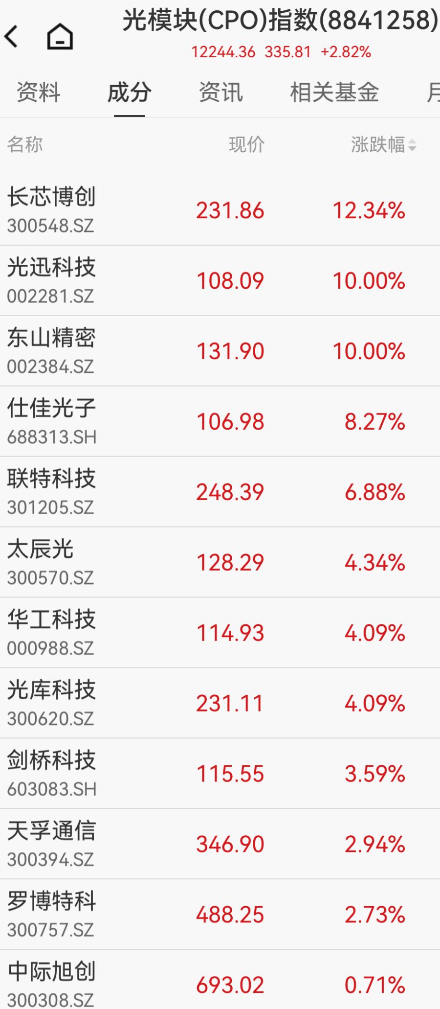4月9日,光模块(CPO)指数震荡走高,长芯博创(300548)涨超12%领涨,东山精密(002384)2天2板,光迅科技(002281)涨停,仕佳光子、联特科技(301205)涨超5%跟涨。