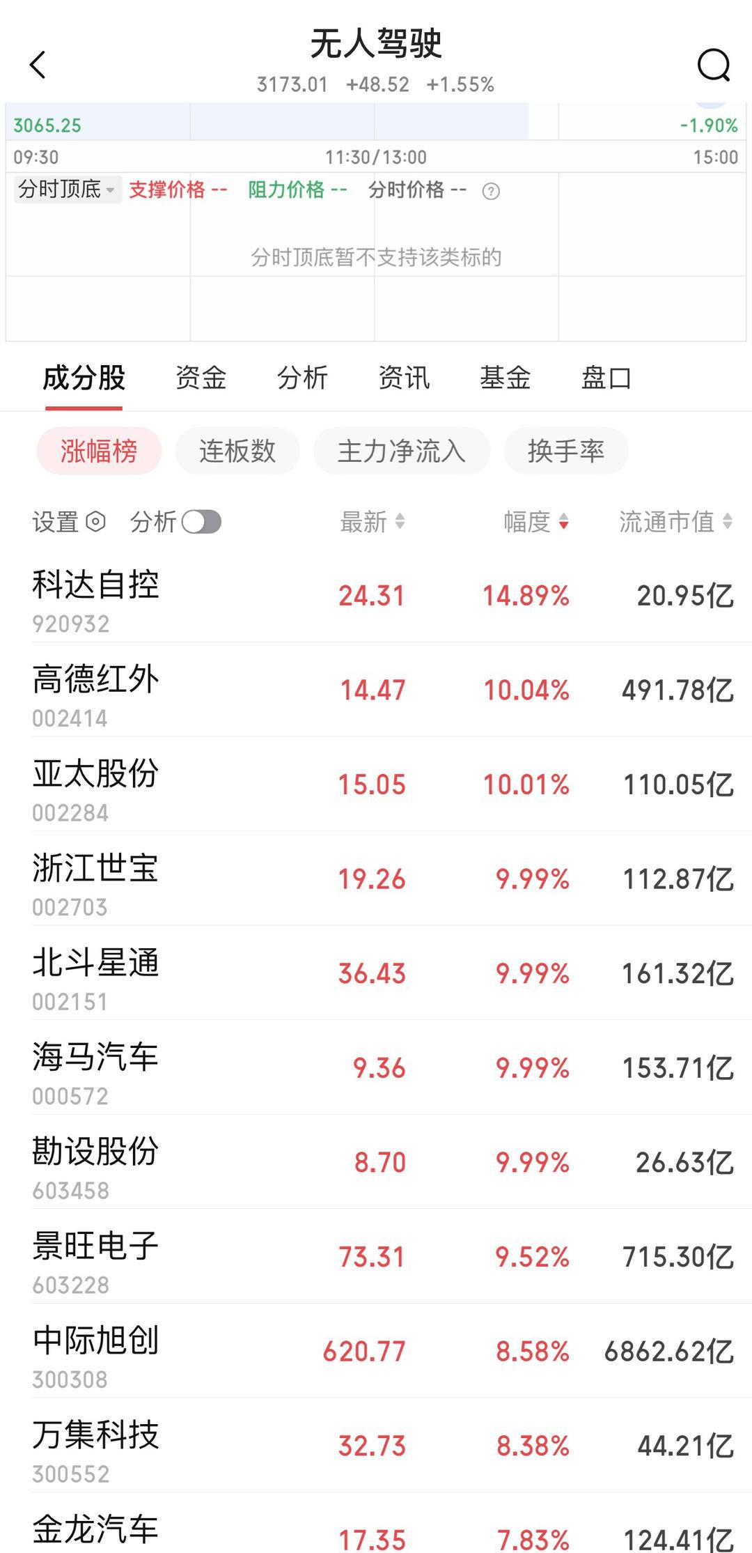 今天盘面上,智能驾驶板块高德红外(002414)、科达自控、浙江世宝(002703)、亚太股份(002284)、北斗星通(002151)、海马汽车(000572)等多只概念股涨停。多家机构盯上了智能驾驶板块的利好刺激。