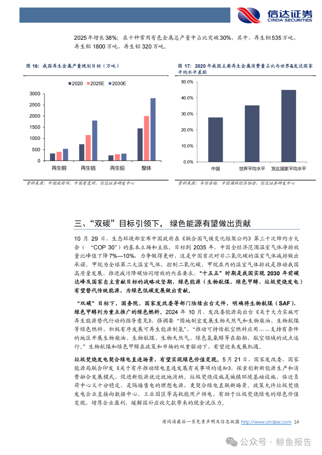 循环经济成为降碳核心抓手,细分领域潜力释放。政策明确2030年大宗固体废弃物年利用量达45亿吨,主要资源产出率较2020年提高45%。再生塑料方面,全球废塑料回收率仅9%,各国密集出台回收政策,欧盟计划2030年塑料包装回收率达45%,美国、印度要求再生材料含量分别达30%、25%,行业从“可选项”转向“必选项”。再生金属兼具减排与资源自给属性,生产1吨再生铜可减排3.5吨CO ,中国有色金属工业协会预测2030年主要再生有色金属产量达2800万吨,较2025年增长38%。