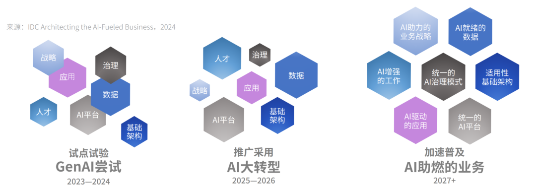 生成式AI无疑是当前变革的核心驱动力。自2023年起,生成式AI的迅速发展使得企业纷纷向AI驱动的商业模式转型。从整个发展阶段来看,2023-2024年为试点实验期,企业开始尝试应用生成式AI;2025-2026年,市场进入推广采用阶段,AI大转型开始逐步推进。