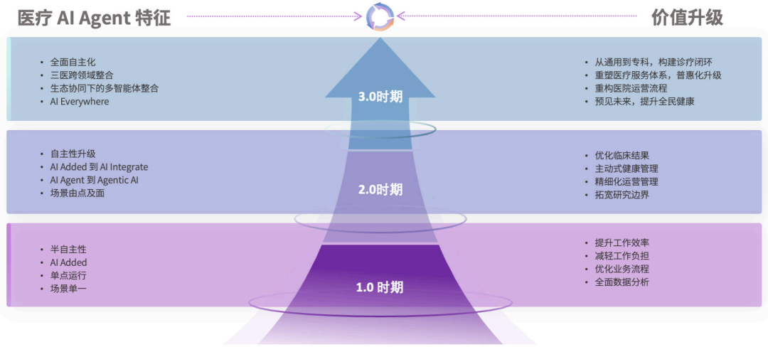 医疗AI的发展路径可划分为三个关键阶段,逐步实现从基础工具到智能伙伴的跃迁: