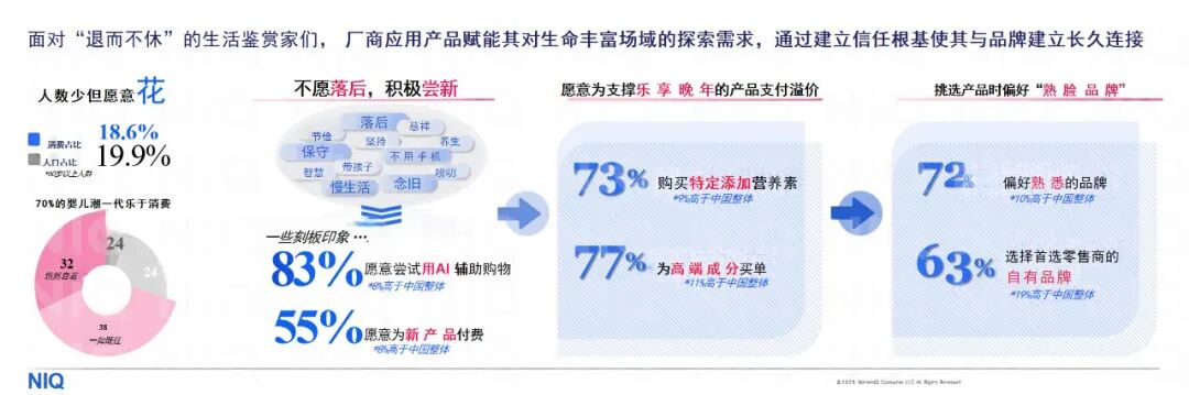 在老龄化浪潮与消费升级的双重驱动下,中国银发经济正经历从"生存保障"到"品质享老"的深刻变革。1962-1975年出生的婴儿潮一代展现出颠覆传统认知的消费特征。其中,70%的积极消费意愿、83%接受AI购物、55%的新产品付费率,正在重塑市场的价值逻辑。