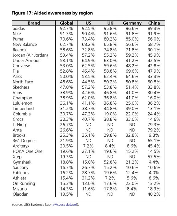 整体而言,瑞银预计2026年运动服饰市场需求将持续增长,特别是在消费者对健康和运动休闲文化的关注日益增强以及对于运动品牌忠诚度与认知持续提升的大背景下。尤其是运动品牌忠诚与认知度持续扩张,这也是瑞银看好该软线零售细分领域的核心逻辑之一,瑞银这份研究报告中的品牌认知度统计数据表明,耐克(Nike)和阿迪达斯(Adidas)在全球范围内都具有较高的消费者知名度,尤其是在中国市场,耐克与阿迪达斯的品牌认知度断崖式领先其他竞争品牌。