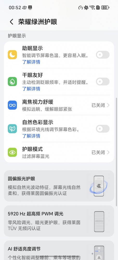 更难得的是,高刷并未牺牲护眼能力。荣耀WIN的这块荣耀AI绿洲护眼电竞屏还获得了德国莱茵最高等级全局护眼5.0认证,并且拥有5920Hz PWM调光窄黑条方案和圆偏振光显示2.0技术的加持,我们在15nits低亮度下长时间玩《星穹铁道》,眼睛几乎无疲劳感。加上圆偏振光显示2.0技术,即使佩戴偏光太阳镜,屏幕亮度也几乎无衰减,这在户外场景非常实用。