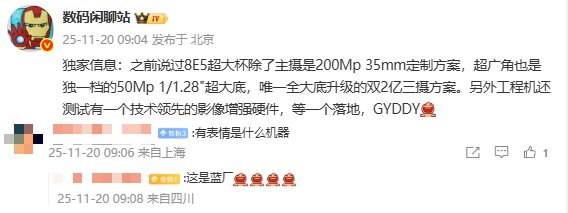 10月13日,vivo X300系列正式发布,包含vivo X300和vivo X300 Pro两款机型,全球首发搭载了联发科天玑9500旗舰平台,并且联合索尼和三星打造了三大旗舰传感器,阵容堪称豪华,一经亮相便受到了众多摄影爱好者的关注。而在早前的爆料中,该系列还将有一款超大杯旗舰等待与大家见面。现在有最新消息,近日有数码博主进一步带来了该机在影像上的更多细节。