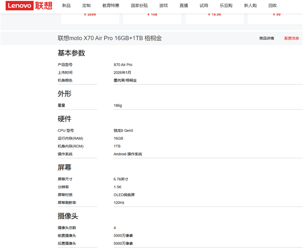 据联想官方最新发布的信息显示,与此前曝光的消息基本一致,全新的联想moto X70 Air Pro现已开启预约,定位轻薄影像旗舰。结合此前相关爆料,该机正面将采用一块6.78英寸OLED微曲屏,京东方Q10材质,分辨率为1.5K,支持超声波指纹解锁。机身背部,该机将提供墨岚黑、梧桐金两款配色。此外,该机将采用全金属中框设计,并且将延续X70 Air系列的轻薄设计,机身厚度仅约7毫米,重量为187克,非常轻薄。