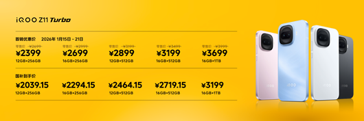 售价方面,iQOO Z11 Turbo提供12GB+256GB至16GB+1TB五种存储版本。1月15日至21日首销期间,官方优惠价为2399元起。若叠加国家补贴,到手价最低仅需2039.15元。