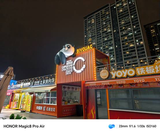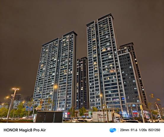 夜景拍摄一直是智能手机影像的难点,但荣耀Magic8 Pro Air凭借其强大的影像系统,轻松攻克了这一难题。在夜间或暗光环境下,主摄的超大光圈和大底传感器能够捕捉到更多的光线,拍摄出明亮且清晰的照片。即使在极低光的场景下,照片的噪点控制也十分出色,细节依然丰富可见。