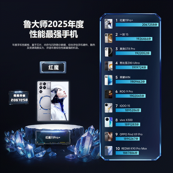 红魔 11Pro+ 荣登“2025年度性能最强手机”。它用 2067258 的惊人跑分 证明:极致性能不仅能冲榜,更能稳定落地。行业首创“风冷+水冷”散热系统让性能释放不再短跑式爆发,而是更持久、更稳态的高帧输出,树立电竞旗舰的硬核标准。