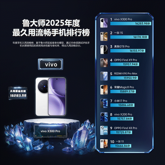 vivo X300 Pro 荣获“2025年度最久用流畅手机”。依托天玑9500与自研蓝河流畅引擎,它在超核计算与光子存储能力加持下,以 16283.98 的高分验证长期使用依旧响应迅捷,体现了“耐久流畅”从口号到能力的落地。