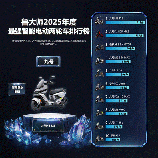 九号 M5 125 荣获“2025年度最强智能电动两轮车”。从多模态解锁到车辆状态可视化,再到全链路互联体验,九号让两轮车从交通工具进化为数字生活的移动节点,最终以 915 分智能总分 领跑榜单,成为年度智能两轮出行的标杆产品。