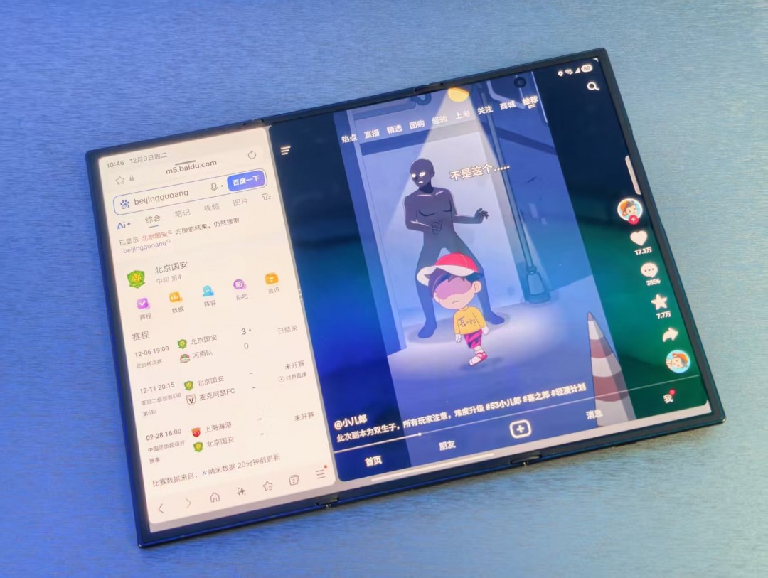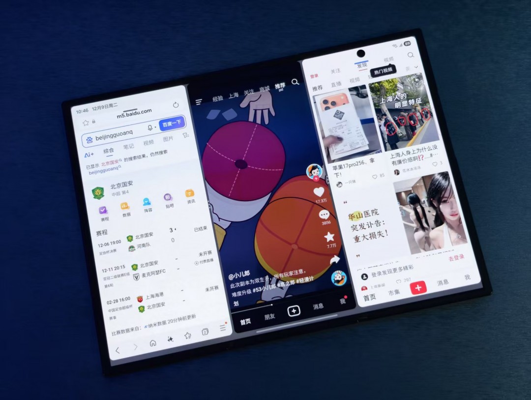 Galaxy Z TriFold最大的亮点无疑是那块10英寸Dynamic AMOLED 2X大屏幕。从手机瞬间转换为平板的视觉冲击非常强烈,实际可视面积相当于3台6.5英寸直板机并排,视野开阔程度令人惊叹。