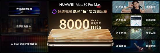 对于屏幕,华为Mate 80系列这次可谓拿出了自己的杀手锏,华为Mate 80 Pro Max搭载了一块超透亮灵珑屏,它绝对是目前手机中的佼佼者,双层OLED结构让屏幕在亮度、耗电和使用寿命上都有大提升——峰值亮度也能达到8000nits、全屏亮度可达2000nits,夏天正午在户外看手机,字也能看得清清楚楚十分通透。