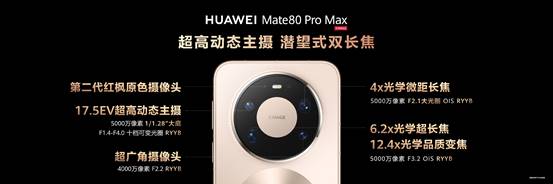 华为Mate 80 Pro Max的5000万像素超高动态主摄,达成17.5 EV业界最高动态范围,较前代提升17倍。搭配5000万像素双长焦,4倍超聚光微距长焦、6.2倍超长焦,支持12.4倍光学品质变焦,中长焦视频清晰度较前一代提升78%,超长焦视频清晰度较前一代提升182%。此外,还有一颗4000万像素超广角摄像头,覆盖多场景拍摄需求。