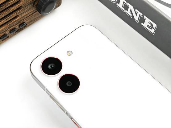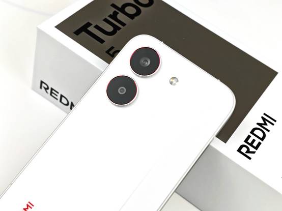 背部上方,Turbo 5的后置相机模组设计延续了整机"至简美学"的理念。双摄系统以竖直排列的方式嵌入背板左上角,两颗镜头外围的金属装饰环采用了与机身同色的处理,减少了视觉上的割裂感。主摄周围的红色点缀(在祥云白配色上尤为明显)为整机增添了一丝活力。