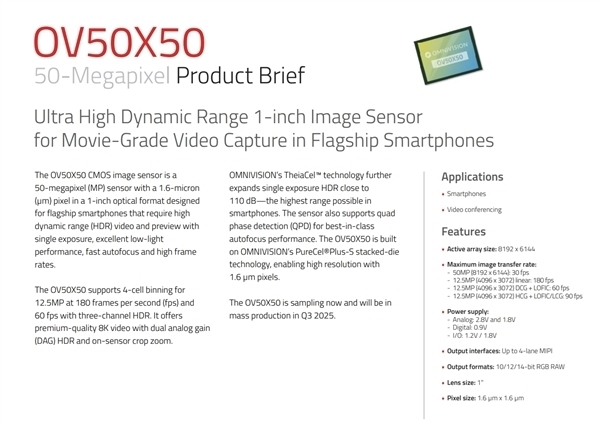 前置摄像头:5000万像素的OV50M传感器