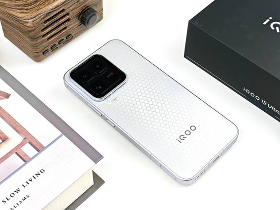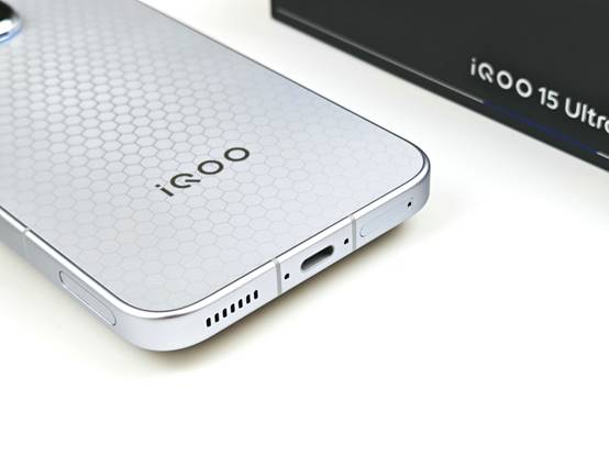 机身背部,此次iQOO 15 Ultra也非常用心,充满了科幻感。该机提供有两款配色,其中2077——致敬《赛博朋克 2077》,而2049则是致敬《银翼杀杀手 2049》,笔者此次拿到的是其中的2049配色版本。这款配色采用哑光银配色为主色调,充满未来美学的设计⻛格,并覆盖了一层六边形蜂巢纹理,官方叫"能量矩阵"设计,采用流转的寒光蓝配色,犹如注⼊体内随时苏醒的超级能量。