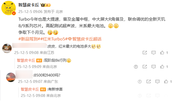 据知名数码博主@智慧皮卡丘 最新发布的信息显示,与此前曝光的消息基本一致,全新的REDMI Turbo 5系列将大提速,迎来显著升级,将全面普及金属中框设计,中大屏尺寸搭配大R角的设计也将成为标配。更是有望支持超声波指纹识别,将为用户带来更加便捷、高效的解锁体验。硬件上,该机将搭载联合调优的全新天玑8/9系列芯片,性能表现值得期待。此外,新机或配备米系迄今为止最大的电池,续航能力有望实现质的飞跃。