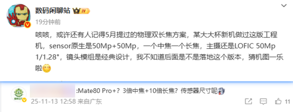 华为Mate80 Pro+或搭载双长焦:主摄采用1/1.28英寸LOFIC超大底传感器