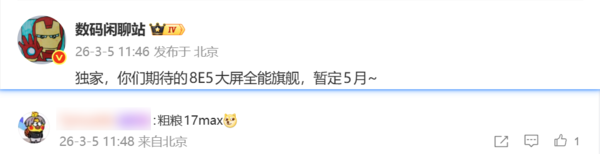 据知名数码博主@数码闲聊站 最新发布的信息显示,一款搭载第五代骁龙8至尊版移动平台的大屏全能旗舰暂定5月发布。据网友猜测,这款新机就是即将亮相的小米首款Max高端旗舰——小米17 Max。据悉,作为小米数字系列的新尝试,小米17 Max将主打极致的大屏视觉体验与强悍的长续航能力。其中在外观设计上,相比之前的小米17 Pro系列,小米17 Max将取消背部副屏设计,转而采用更大的主显示屏幕以提供更佳的视觉体验。而在续航方面,该机将内置8000mAh的超大容量电池,并支持100W有线快充与50W无线快充。这不仅是小米数字系列历史上电池容量最大的机型,更标志着小米旗舰手机首次迈入了8000mAh长续航时代。