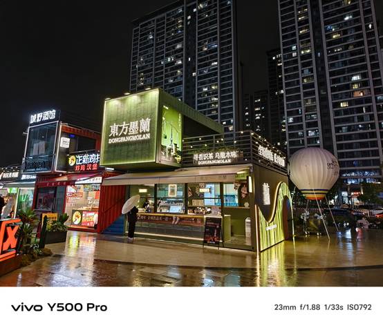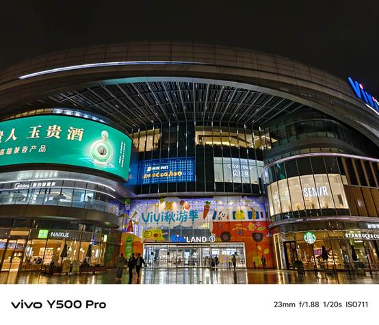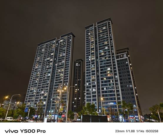 通过实际拍摄,我们发现vivo Y500 Pro在夜景模式下能够很好地控制噪点,画面纯净度高。即使在光线较暗的环境中,也能清晰地捕捉到细节,如远处的霓虹灯和建筑轮廓。此外,vivo的色彩调校在夜景拍摄中也发挥了重要作用,让照片的色彩更加丰富和自然,避免了常见的偏色问题。