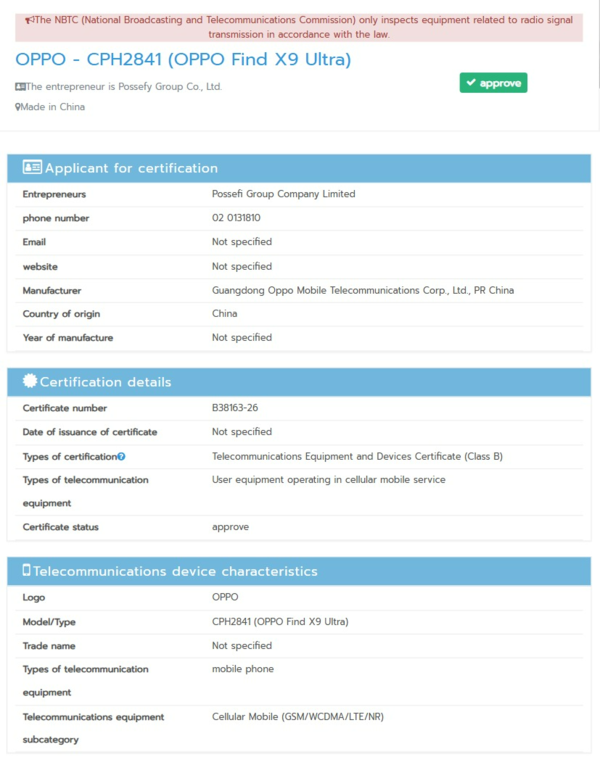 去年10月16日,OPPO新一代影像旗舰Find X9系列正式亮相,先期推出了Find X9和Find X9 Pro两款机型,一经发布便受到了用户的广泛好评。而根据此前相关爆料,Find X9系列接下来还将推出Find X9 Ultra和Find X9s两款机型,将在本月与大家见面。现在有最新消息,近日有外媒发现这两款机型已经出现在泰国NBTC的认证平台。
