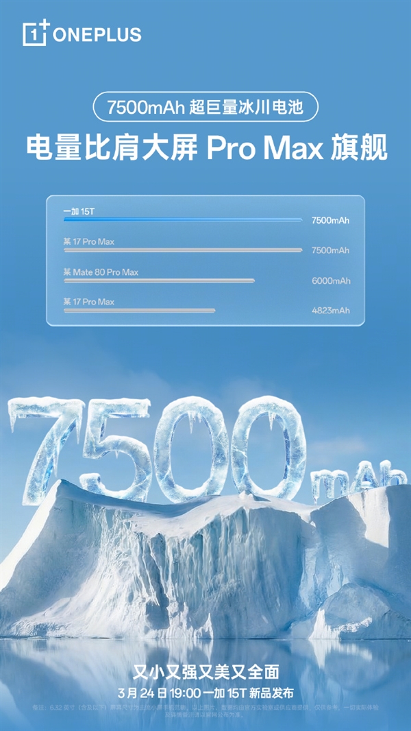 一加15T全球首发7500mAh超巨量冰川电池:断层碾压其他所有小屏