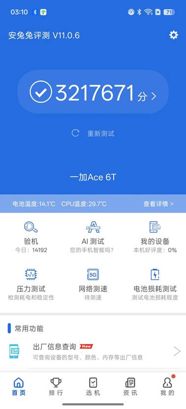 在安兔兔跑分测试中,一加Ace 6T轻松突破300万大关,达到了3217671分。这一成绩充分展现了第五代骁龙8移动平台旗舰芯片的强大性能,在同价位段的手机中稳坐头把交椅,成为性能旗舰中的佼佼者。