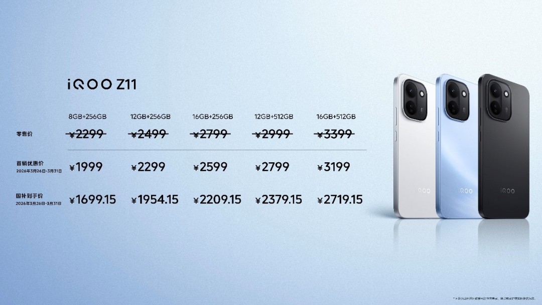 iQOO Z11 共有 5 个版本可供选择,8GB+256GB 版本首销优惠价 1999 元(零售价 2299 元,国补到手价 1699.15 元)、12GB+256GB 版本首销优惠价 2299 元(零售价 2499 元,国补到手价 1954.15 元)、16GB+256GB 版本首销优惠价 2599 元(零售价 2799 元,国补到手价 2209.15 元)、12GB+512GB 版本首销优惠价 2799 元(零售价 2999 元,国补到手价 2379.15 元)、16GB+512GB 版本首销优惠价 3199 元(零售价 3399 元,国补到手价 2719.15 元)。