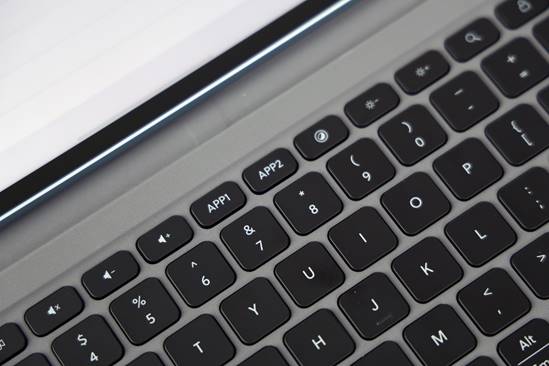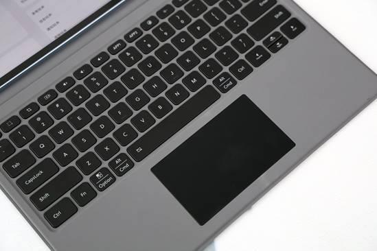 智能触控键盘 6 Pro 采用皮革材质,内侧为绒皮质感,通过磁吸方式与平板连接,背部下折即可形成支架,支持 140° 无级调节,1.5mm 键程按压清脆。