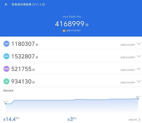 跑分测试中,vivo Pad6 Pro 的安兔兔综合跑分突破 410万,其中 CPU 得分 1185697 分,GPU 得分 1549988 分,超越 96% 以上,各项成绩均处于安卓平板顶尖水平。