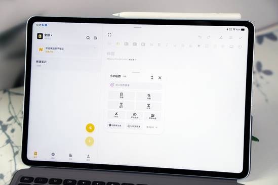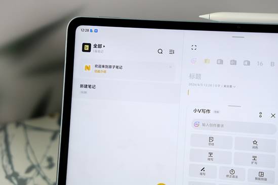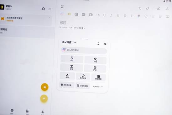 原子笔记功能深度适配办公与学习场景,支持导入 PDF 课件、会议材料,搭配 vivo Pencil3 可直接圈划、写字、插入图片,实现无纸化批注;提供无界纸张模式,可自由创作思维导图与流程图,不受页面大小限制;还支持提笔忘字、汉字联想、错字纠正等功能,手写拼音可自动转为汉字,成语、诗句可联想补齐;全局可用的小 V 写作功能,支持总结、扩写、续写等,可生成朋友圈文案、小红书笔记、工作总结等多种文体,在 WPS 等第三方应用中也可通过输入法呼出,大幅提升创作效率。