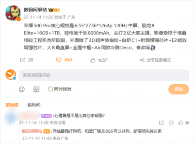 荣耀500 Pro核心规格出炉:搭载骁龙8至尊版 主打2亿大底主摄