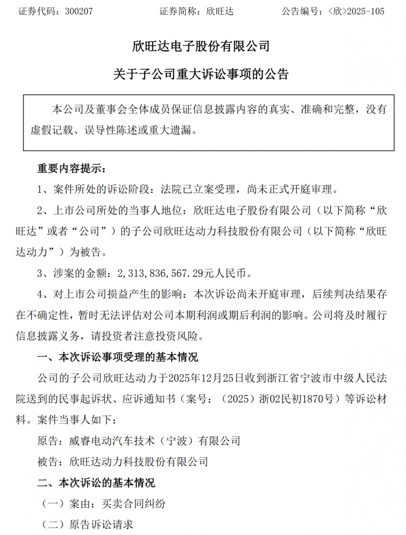 12月27日消息,昨日晚间,A股上市公司欣旺达发布公告,欣旺达动力科技股份有限公司(下称“欣旺达动力”)因买卖合同纠纷被吉利旗下威睿电动汽车技术(宁波)有限公司起诉,涉案金额高达23.14亿元人民币。该案已于近日由浙江省宁波市中级人民法院正式立案受理,案号为(2025)浙02民初1870号,目前尚处于未开庭审理阶段。