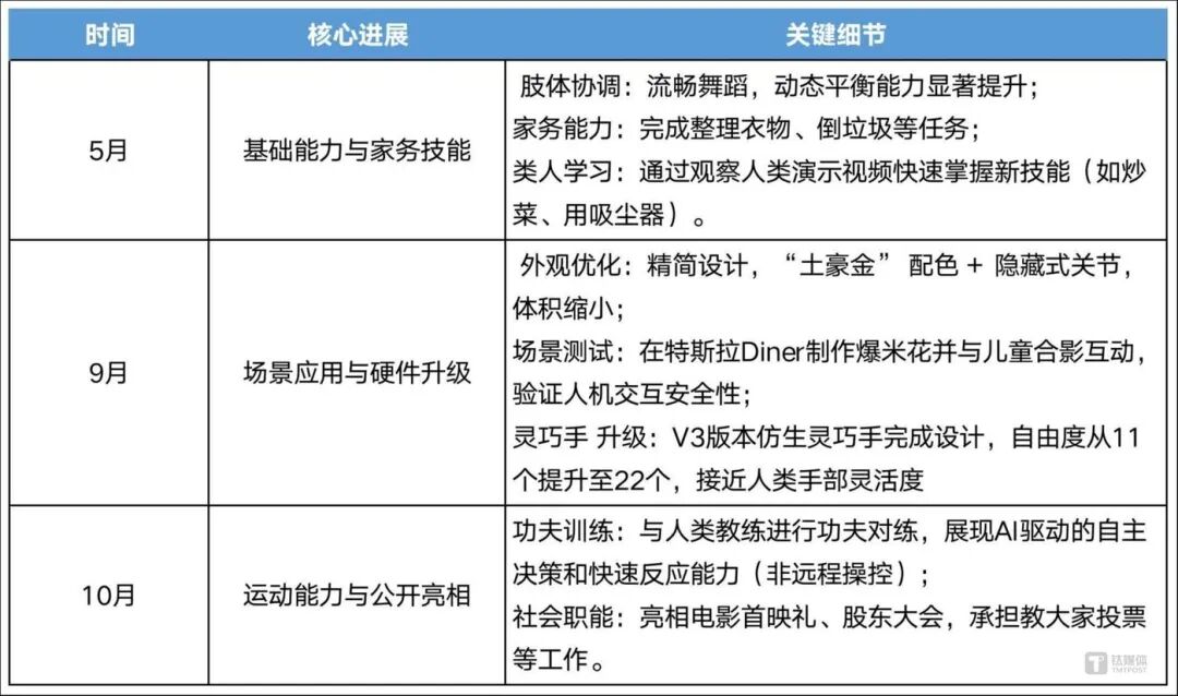 视频内容以时间线呈现Optimus全年关键进展,主要有以下三大节点: