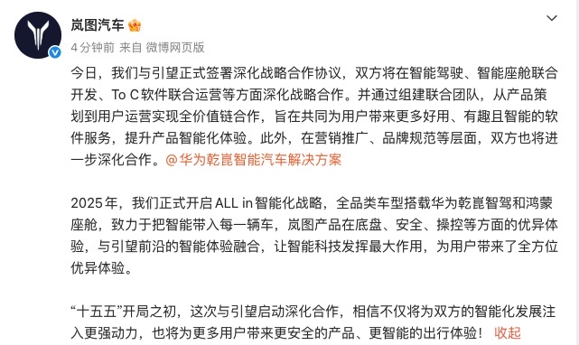 岚图汽车与华为引望深化战略合作 联合开发智能驾驶/智能座舱