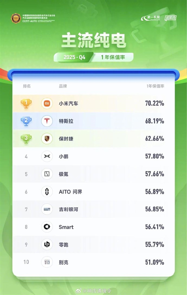 根据保值率研究委员会发布的最新数据,在2025年第四季度主流纯电动汽车的1年保值率排名中,小米汽车表现抢眼,一举成为最保值品牌。