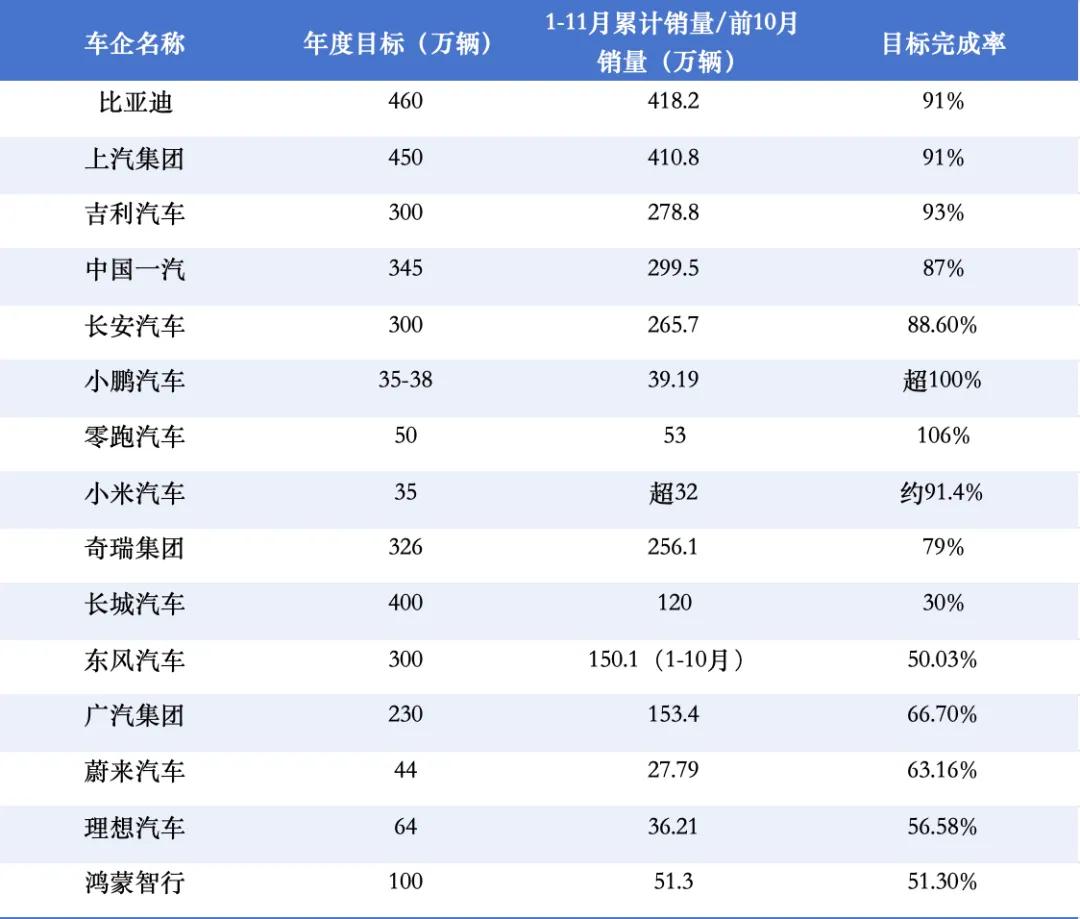 比亚迪与上汽集团1-11 月累计销量均突破400万辆,分别达418.2万辆和 410.8万辆,同比增幅均超10%,对应460万辆、450万辆的年度目标,完成率均达91%,大概率能如期达标。